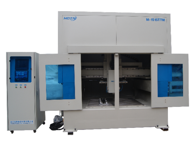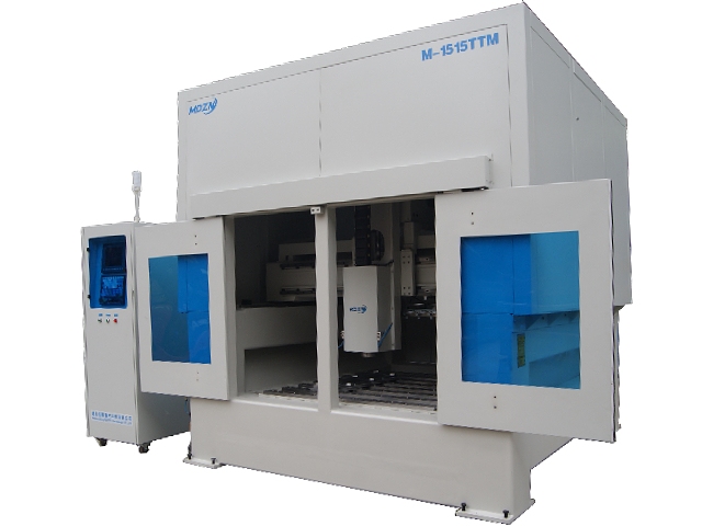 The M-1515TTM Profile Machine features an automatic centralized oil supply system for all transmission components, extending their service life. The machine has two machining chambers, left and right. The Y-axis uses high-precision German gear and rack transmission, while the X/Z axes use ground ball screws for high precision and accurate tool entry. The X, Y, and Z axes use original Taiwanese guideways; the square guideways are advantageous for specific applications, meeting the requirements of high-rigidity, high-load applications.